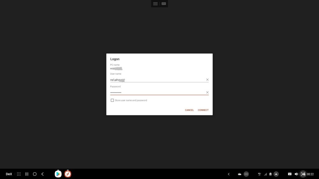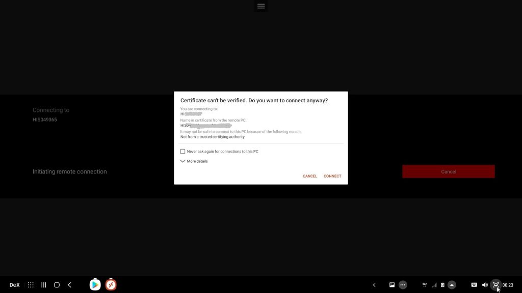 12. If you get a question asking about a certificate, select don’t ask again and click connect.