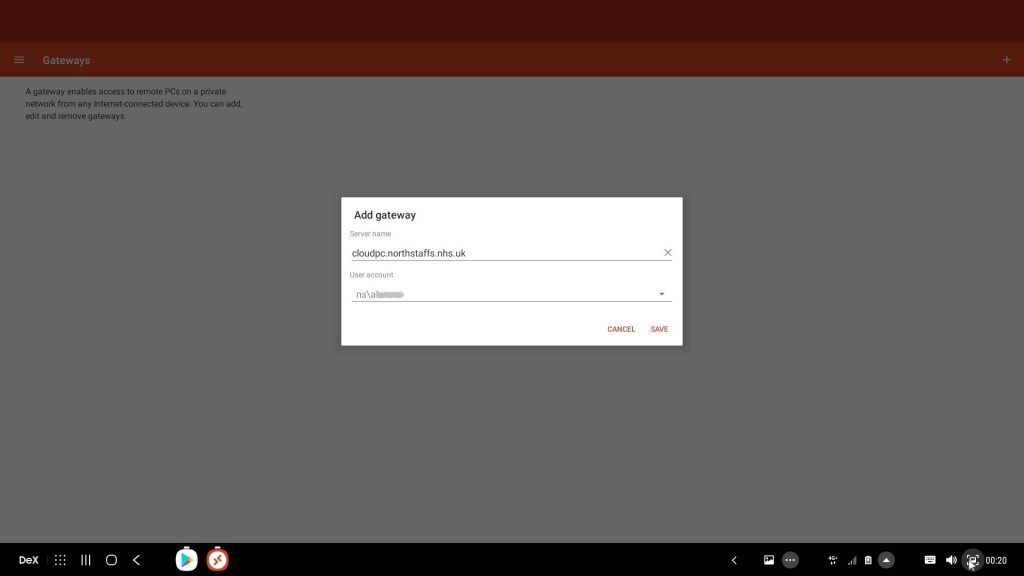 5. In the Add Gateway dialogue box, type cloudpc.northstaffs.nhs.uk. For User account use the drop down to select ‘Add user account’