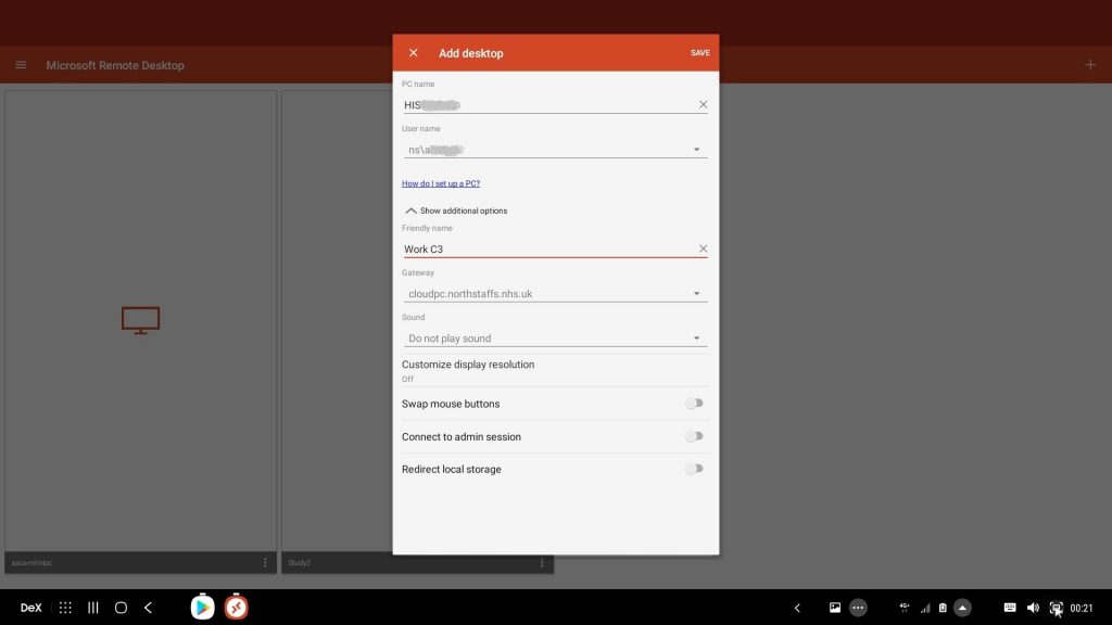 9. Put your the PC number of your work PC in the ‘PC Name’ space. This will be a HISXXXXX or Bxxxxxx number. Under the user nbame space select you username from the drop down menu.