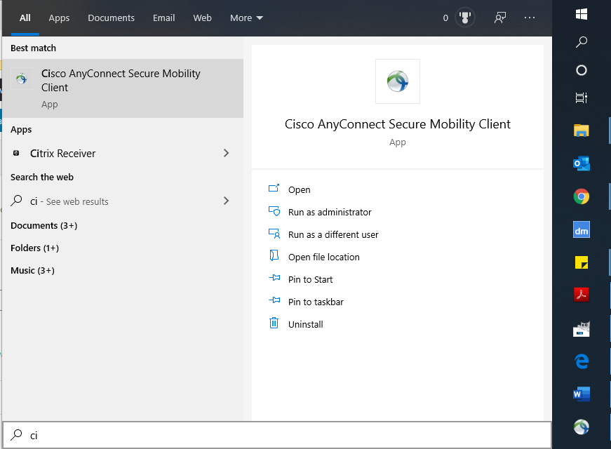 Next you have to load the Cisco software from the Start menu. Click your Windows/start button and run the software you just installed. Its called ‘Cisco AnyConnect Secure Mobility Client’.