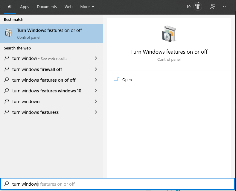 Go to the start Menu and type in “turn windows features on or off”.
