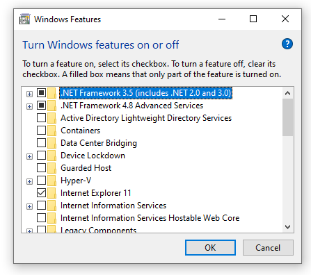 When it launches please ensure the radio button next to the ‘.NET Framework 3.5’ option is selected. If it isn’t already selected like image below, please select it by clicking the square radio button next to text – as shown in the second image below.
