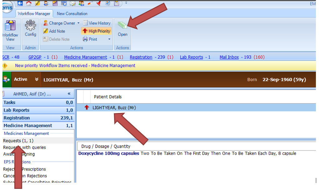At the practice the medication is issued as normal. Under the medication workflow section, select Requests on left and the the patient for whom to issue the medication. Then issue from there as normal.
