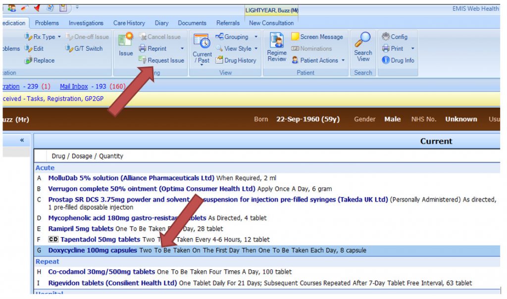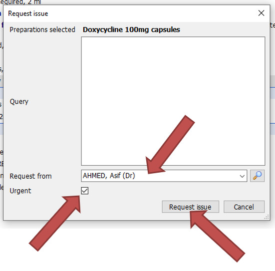Then you go to the medication screen and select the medication that has just been prescribed. And select the ‘Request Issue’ at the ribbon at the top: