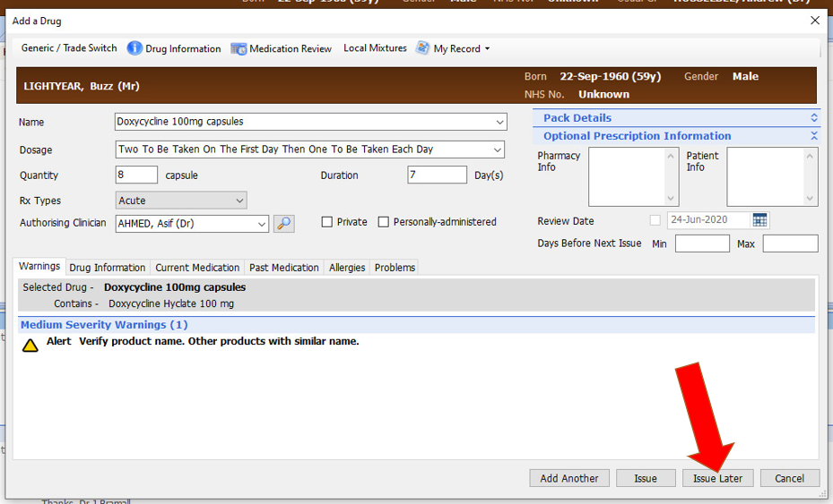 Firstly when you get to the screen to prescribe please click the issue later button:
